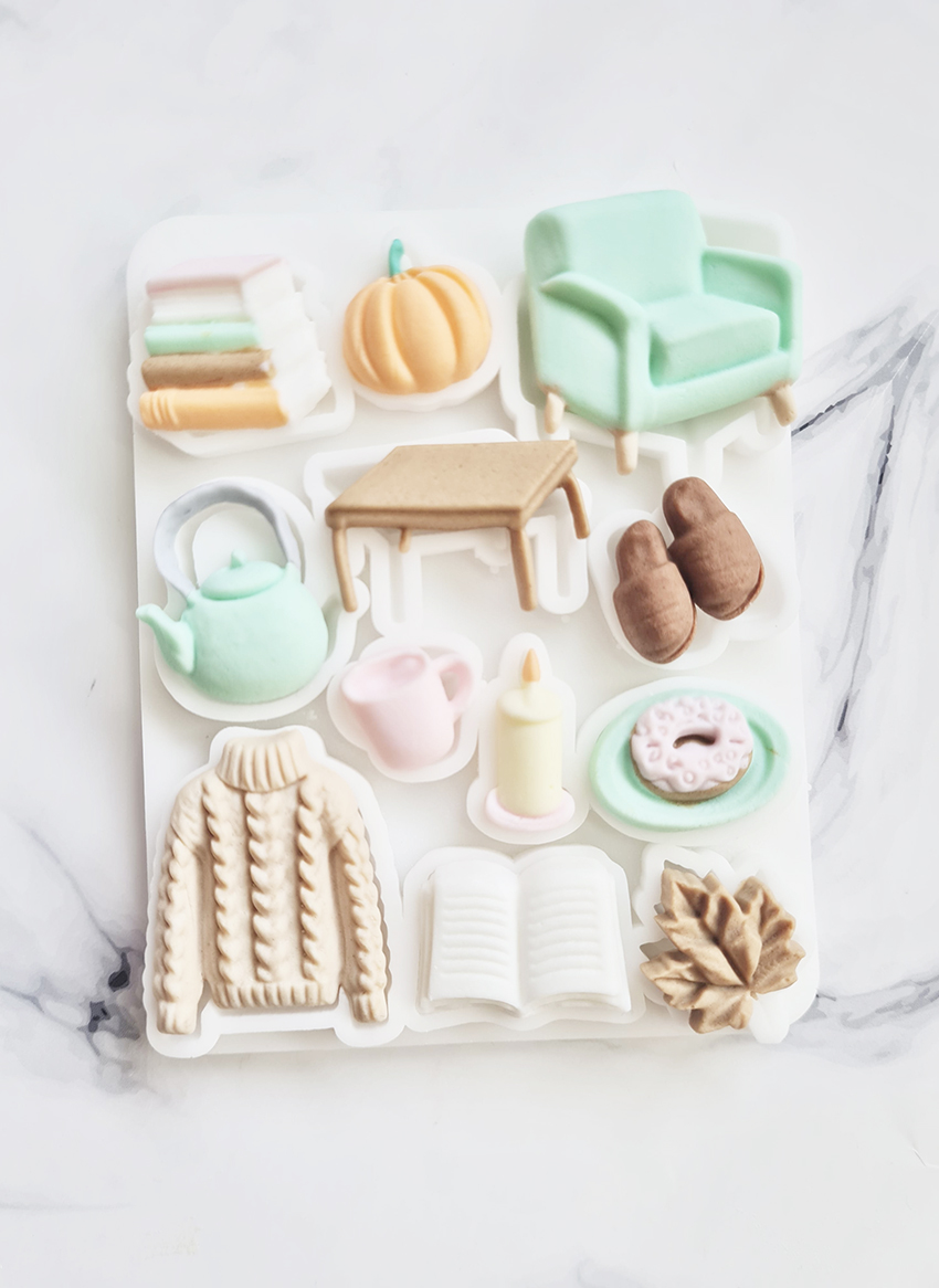 Medidas del Molde: 8,5 x 10,5 Medida de las formitas: sweater 3,5cm / sofa 3,5cm / pava 2,5cm / el resto aproximadamente 2cm (libros, calabaza, mesa, pantuflas, taza, vela, dona, hoja)